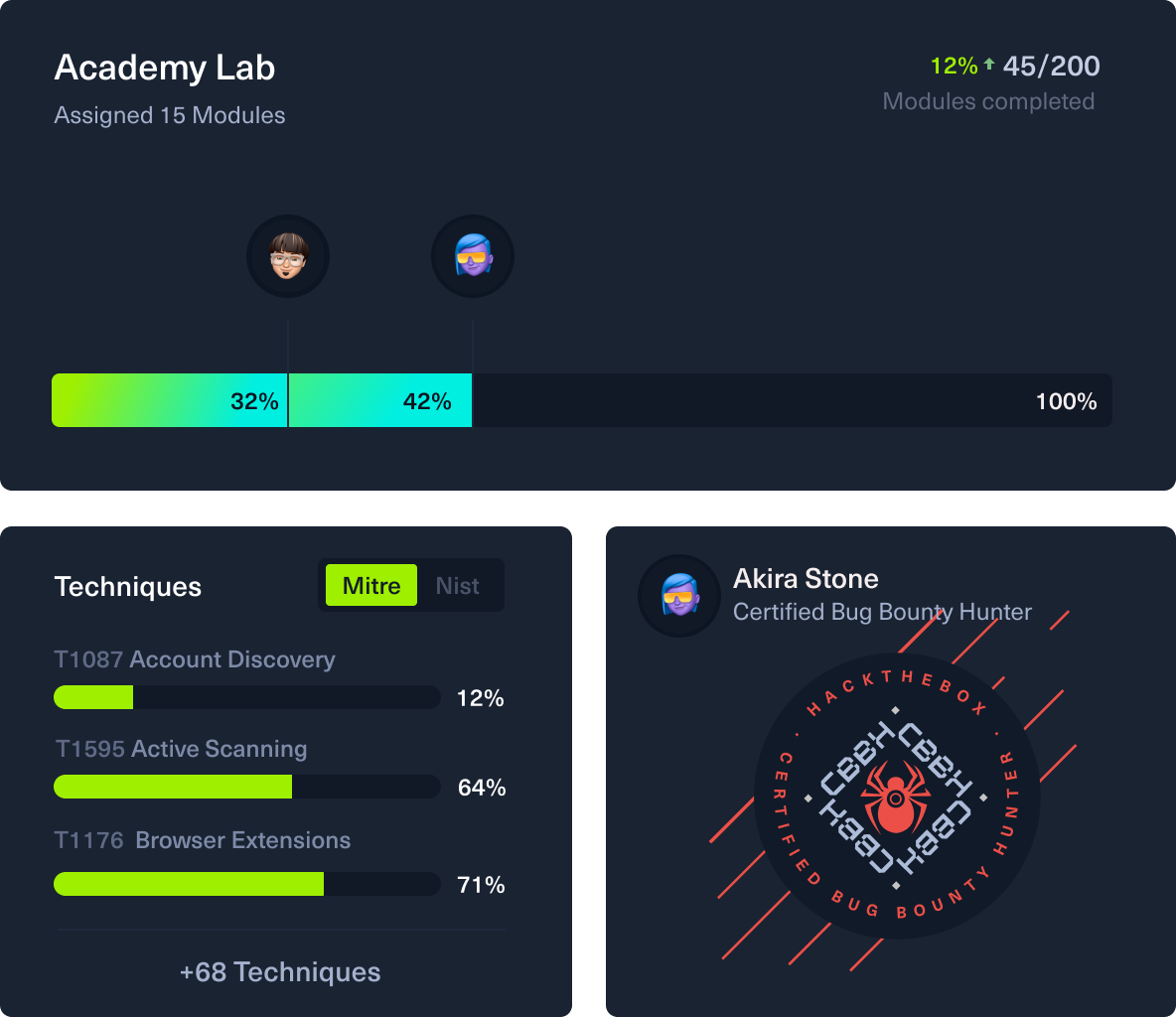 Maximum curriculum management flexibility, enhanced skills reporting, and engaging gamification features. Book a demo to see Hack The Box in action.